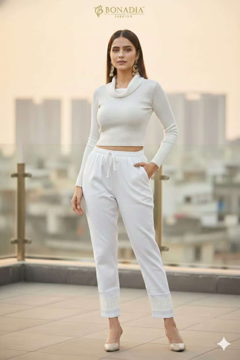cigarette pants, women’s trousers, lace design pants, stylish office wear, party wear bottoms, slim‑fit pants with lace, designer cigarette trousers.