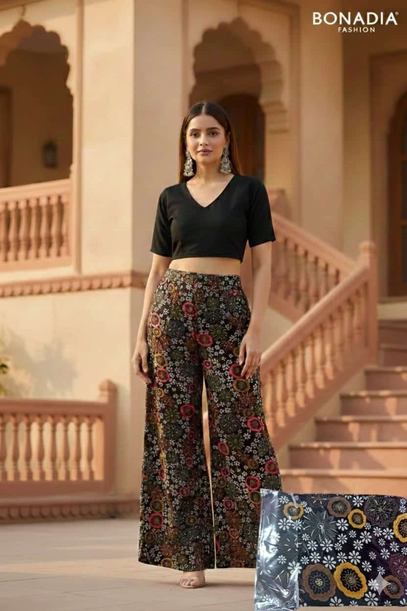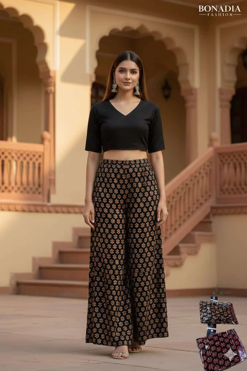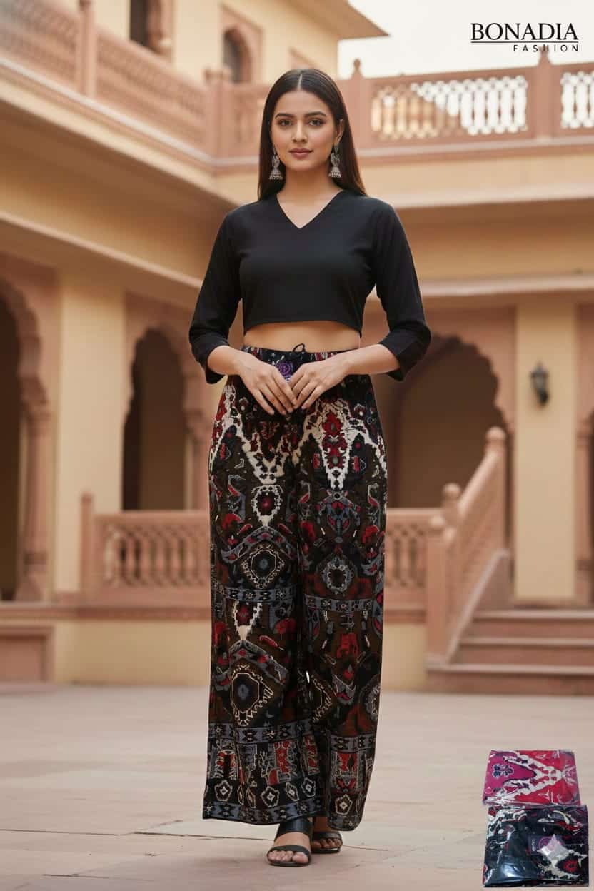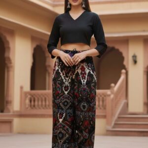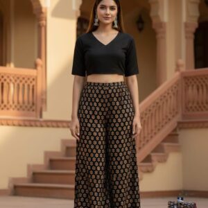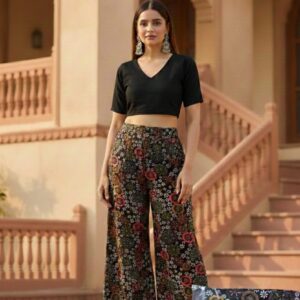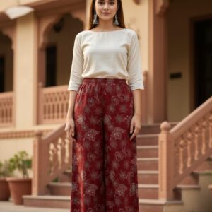 “Comfort meets style with this rayon print plazo, featuring a soft breathable fabric, vibrant patterns, and a relaxed fit perfect for casual outings or festive wear.”