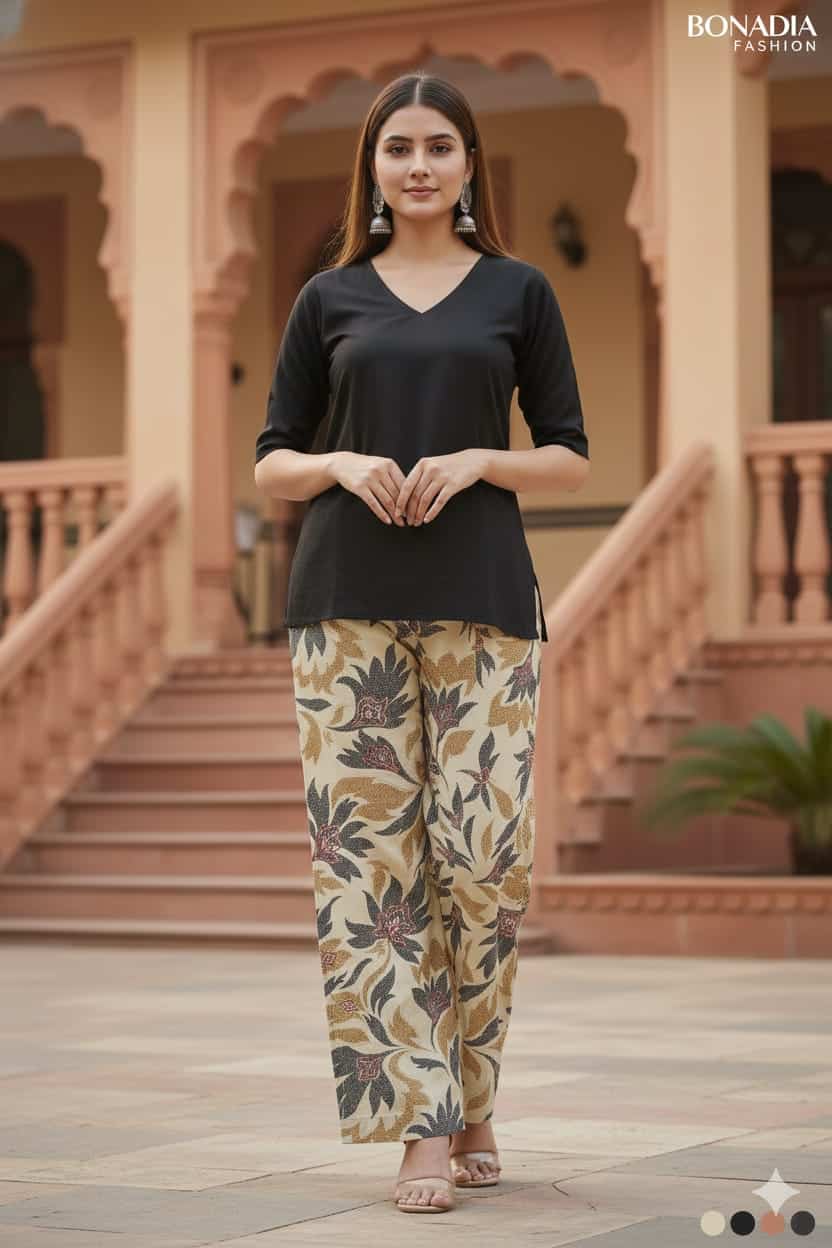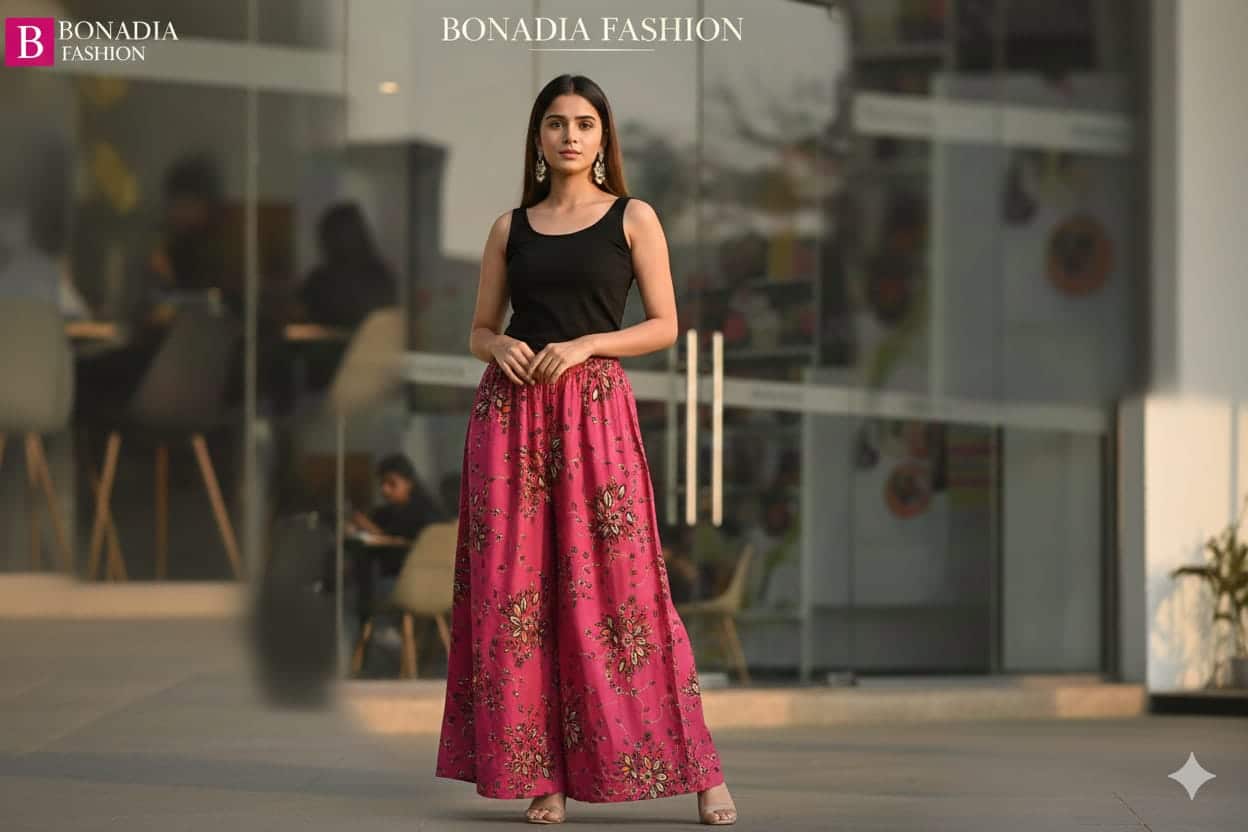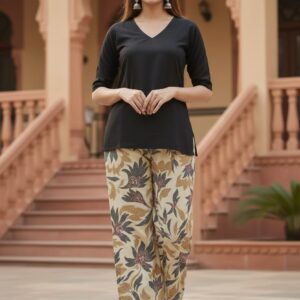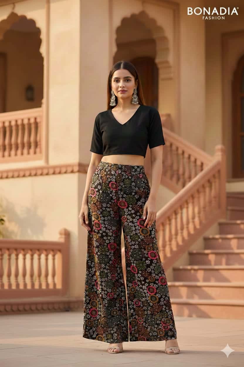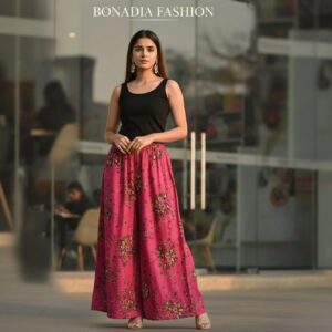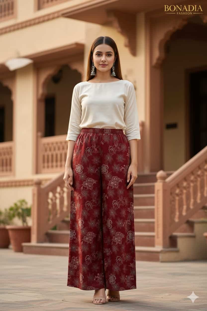 “Comfort meets style with this rayon print plazo, featuring a soft breathable fabric, vibrant patterns, and a relaxed fit perfect for casual outings or festive wear.”